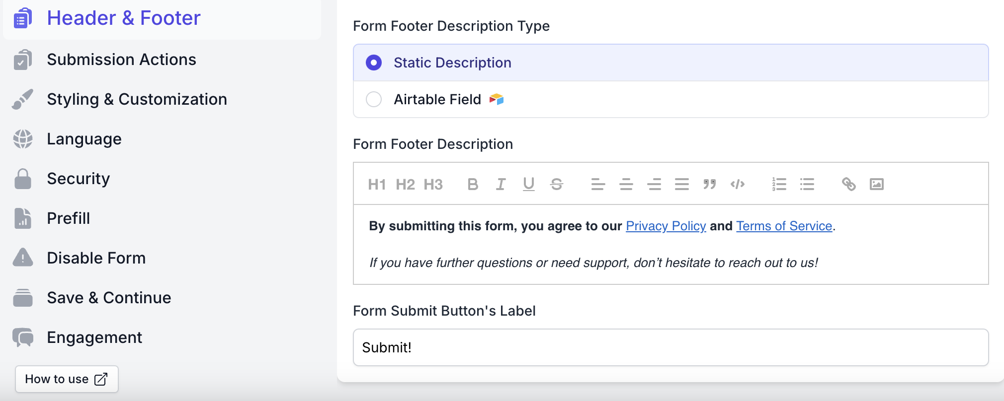 One of the features of miniExtensions Form is the ability to add a custom footer, allowing you to display important information or links consistently at the bottom of your forms.