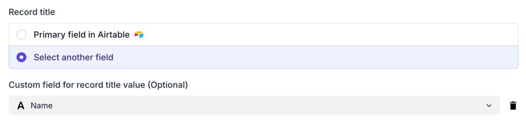 By default, linked records on the miniExtensions Form show the primary field of the linked table as the title of the linked record. If needed, an alternative field can be chosen as the record title, for example in cases where the primary field does not contain the most relevant information for the user, or perhaps too much information that should not be displayed to everybody.