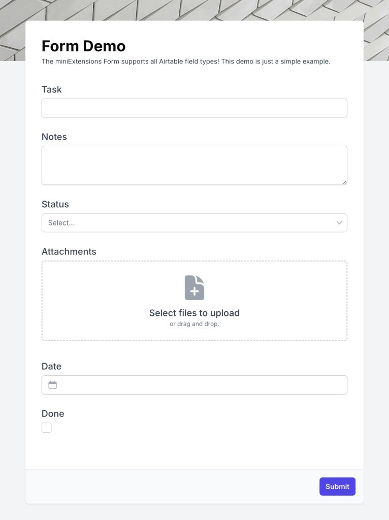 The miniExtensions Form allows you to create, as well as view and update existing Airtable records – all without direct access to Airtable! Any new records created by your users will be saved to Airtable immediately.
