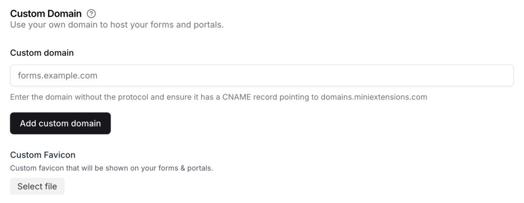 The miniExtensions Form and Portal can be accessed using your own custom subdomain, e.g. forms.yourdomain.com. This is ideal if you want to not show any miniExtensions branding anywhere when accessing your Airtable data, not even in the URL. The custom domain can also be used to redirect to one of your extensions (or somewhere else) when accessed directly (i.e. without a link to a specific extension)!