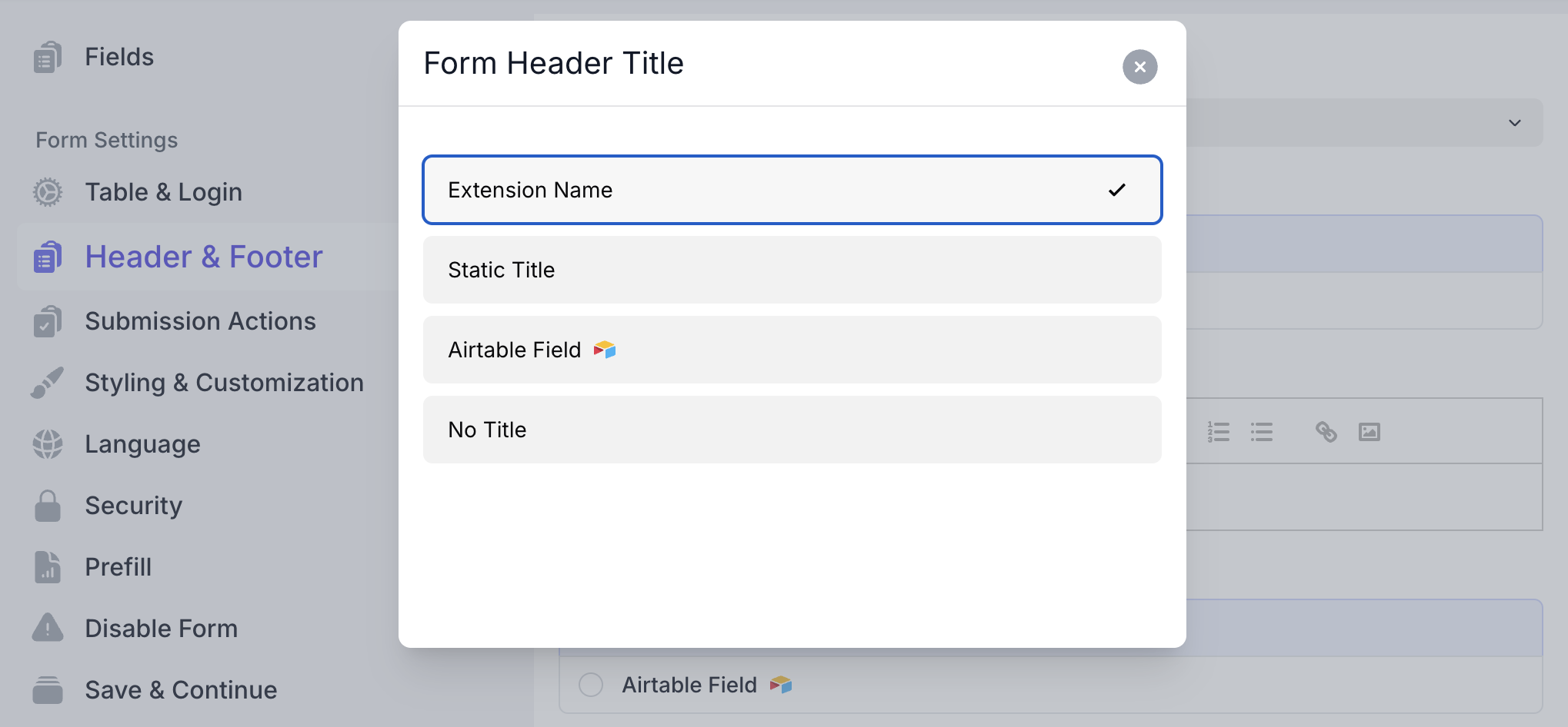 You can use the extension name, set a static title, dynamically update it with an Airtable field, or hide it entirely.