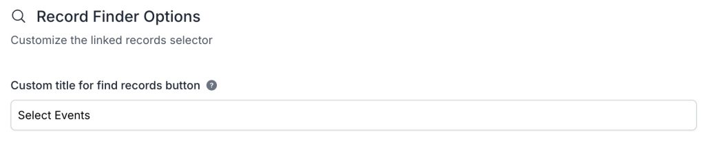 The button to link existing Airtable records on the miniExtensions Form is labeled “Find” by default. However, in some scenarios this may not be the ideal title. In these use cases you can change what is displayed with ease, to make it clear to your users what they need to do.