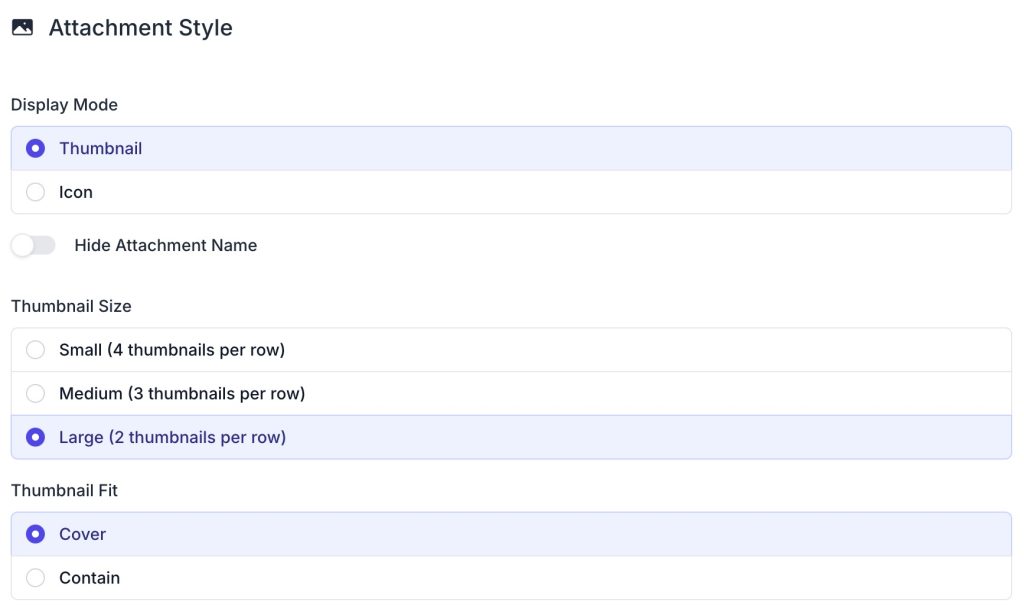 The miniExtensions Form allows you to customize how attachments are displayed. For example, you can determine how many attachments are displayed per row, or how it fits within its bounds.