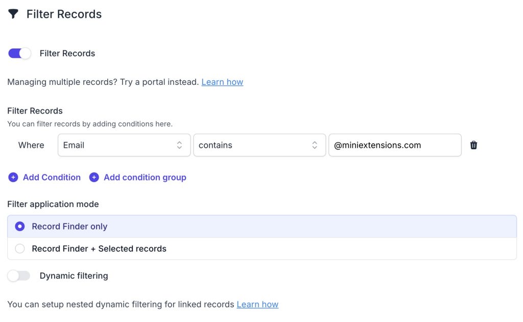 - Static filters: These are filters that are set up in the form’s configuration and can be used to limit the records available for selection in general, e.g. to users with a certain email domain, or events with a certain status etc. You can combine many conditions and use “and” and “or” logic to filter records exactly as needed.