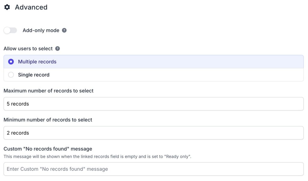 With the miniExtensions Form you can decide if your users can select one, or multiple Airtable records in a field. You can also configure the field to only allow a certain minimum and maximum amount of records to be linked as well.