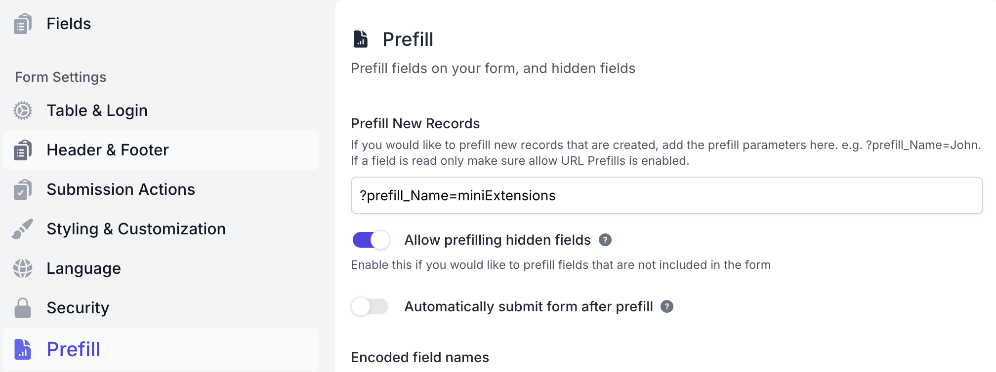 With miniExtensions form, you have the choice to allow prefilling any field, including hidden ones. You can use this feature to send out forms with some prefilled IDs, for instance, without visually showing them in the form. It works by using the prefill_fieldName=parameter