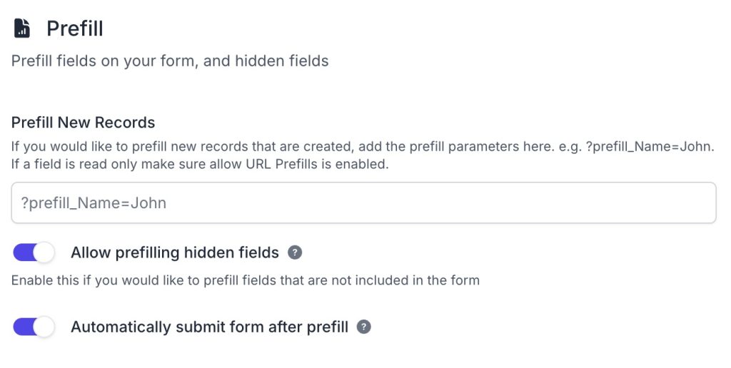 • Prefilling through the form URL: This is the most common use case where you add a prefill parameter to the end of the form’s URL to prefill an Airtable field