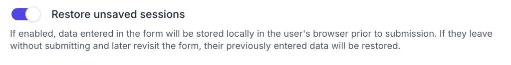 One of the features of miniExtensions Form is the ability to prevent data loss by allowing users to save their progress before submission. The “Restore Unsaved Sessions” option automatically saves data in the user’s browser for new records, enabling users to return later without losing input. When the user returns to the form, they will be presented with an option to continue where they left off, or start from scratch.