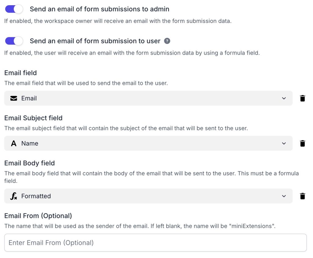 The miniExtensions Form supports automatically sending confirmation emails after successful submissions, to both the user and admin. This ensures users and admins can get instant feedback and a copy of the submission, improving communication and trust.