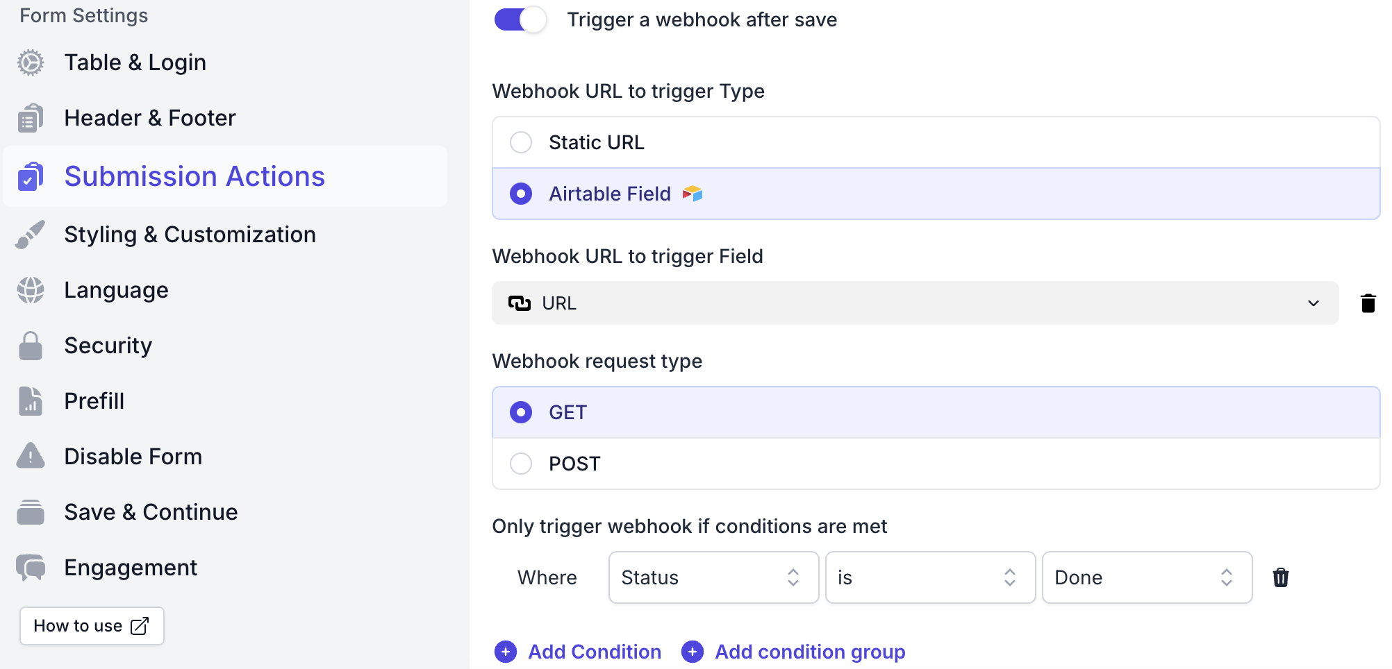 You can configure a dynamic webhook URL using an Airtable field. Additionally, you can set conditions to ensure the webhook is triggered only when specific criteria are met. This includes the ability to add multiple conditions and organize them into condition groups for more complex workflows.